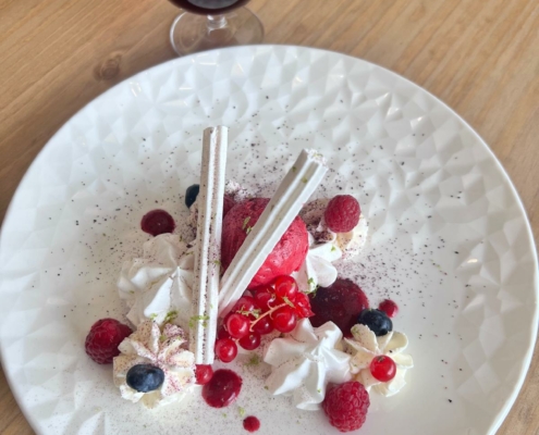 Meringue, glace vanille, fruits rouges frais, fleurs d’hibiscus, chantilly.