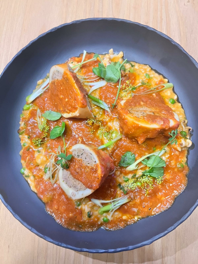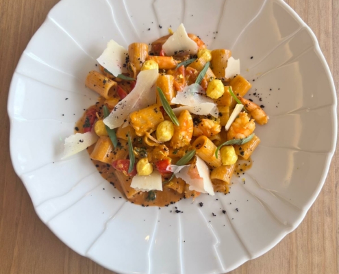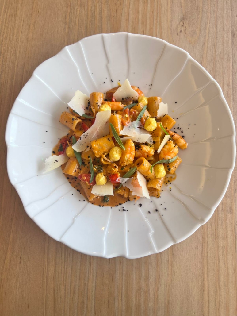 Gambas taillées au couteau, pâtes rigatoni, sauce bisque de gambas, parmesan.