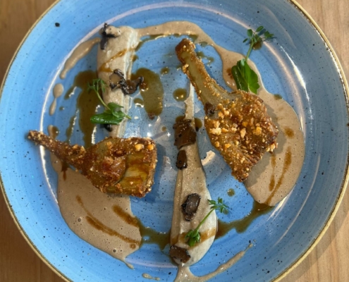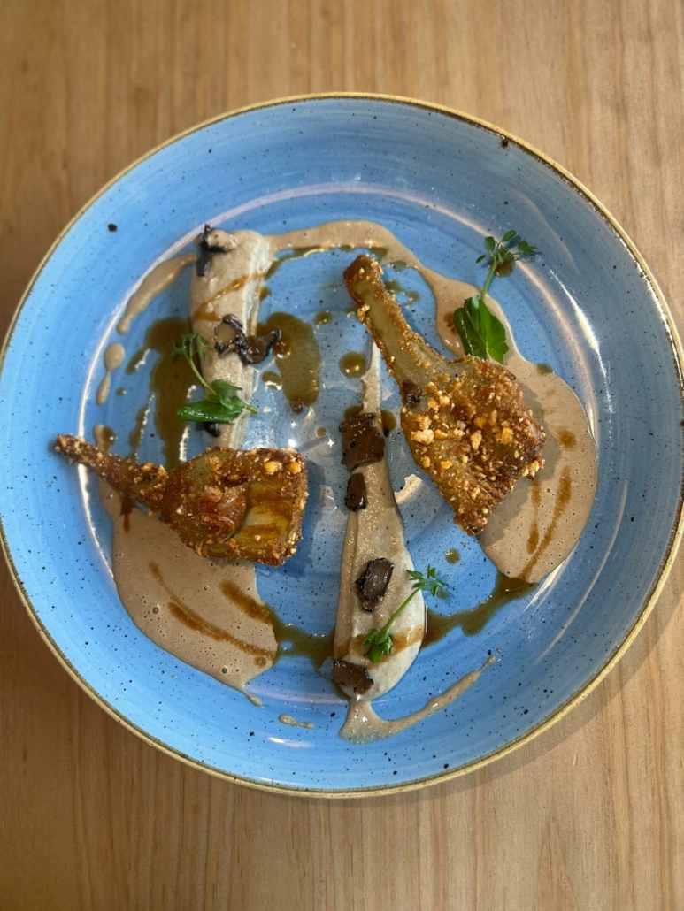 Bouton d’artichaut pané, crémeux d’artichaut, émulsion truffée.