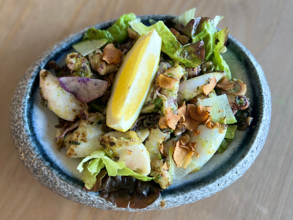 Poulpes cuits, persillade, condiments, salade verte.