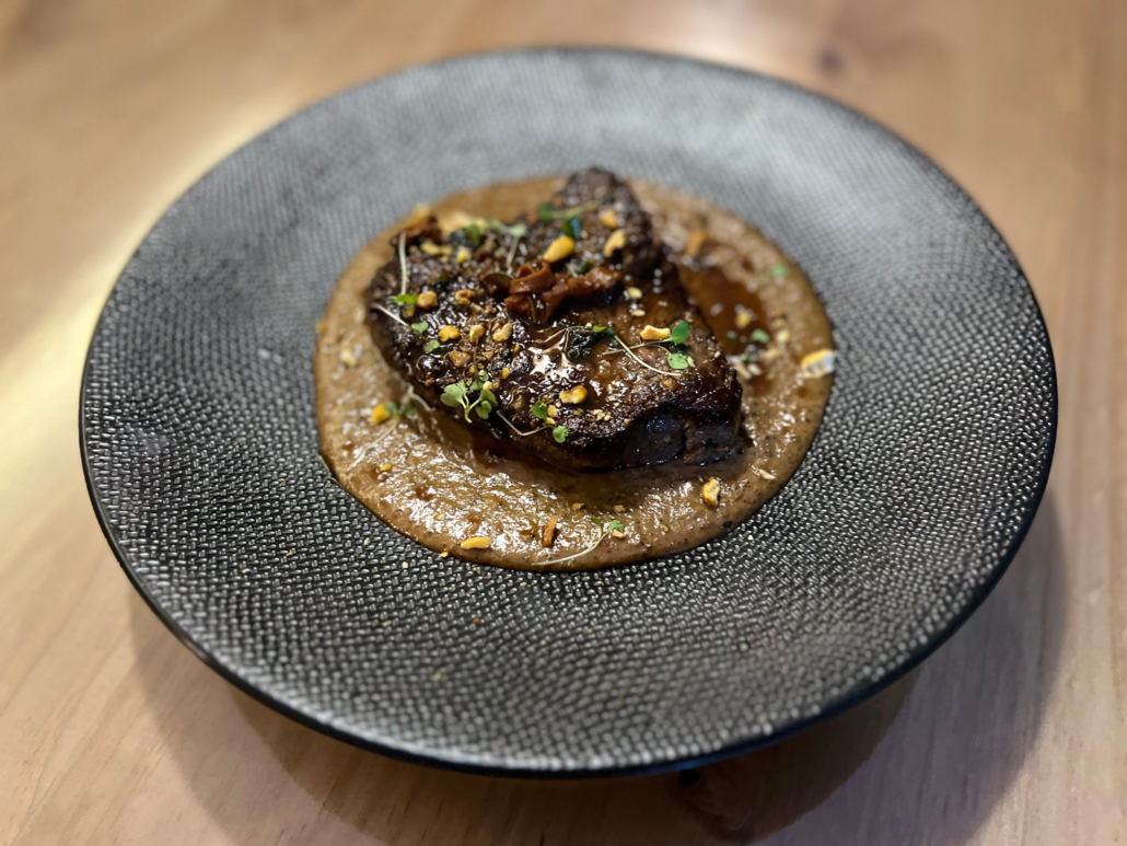 Filet de bœuf, foie gras, brioche, confit d’oignons, écrasé de pommes de terre à la truffe, jus aux morilles.